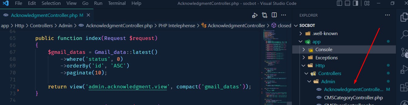 Here is the index function render all data to the Acknowledgment Table. You can set the pagination
