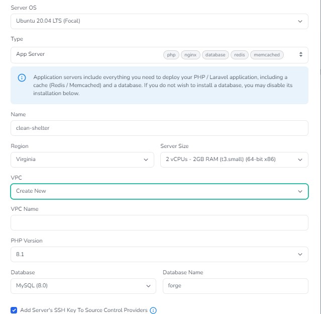 After connecting to your preferred server provider, Forge will be able to provision new servers for you in minutes. We offer you the ability to provision multiple server types (e.g. web servers, database servers, load balancers) with the option of having an array of services configured for you to hit the ground running, including: