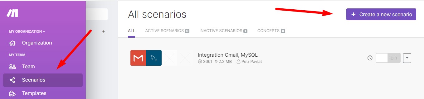 - Login your MAKE account and go Scenario -> create a new Scenario