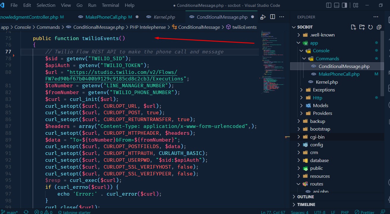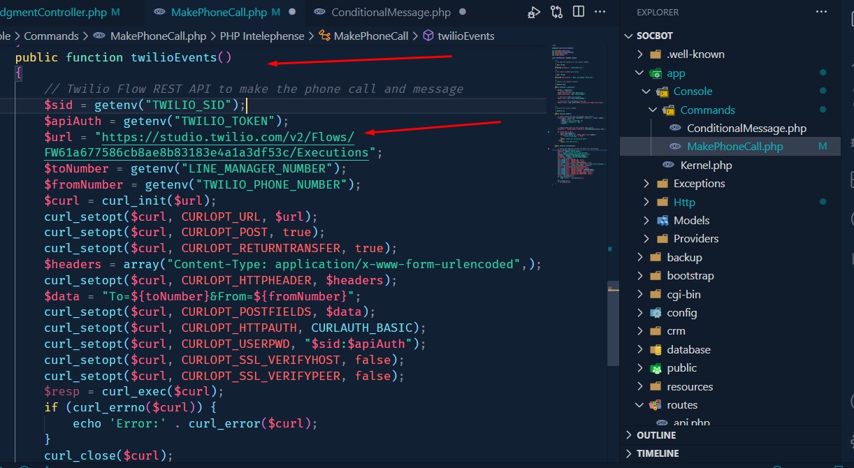 generate automated message to the line manager using Twilio Stuio Flow REST API. check the twilio code